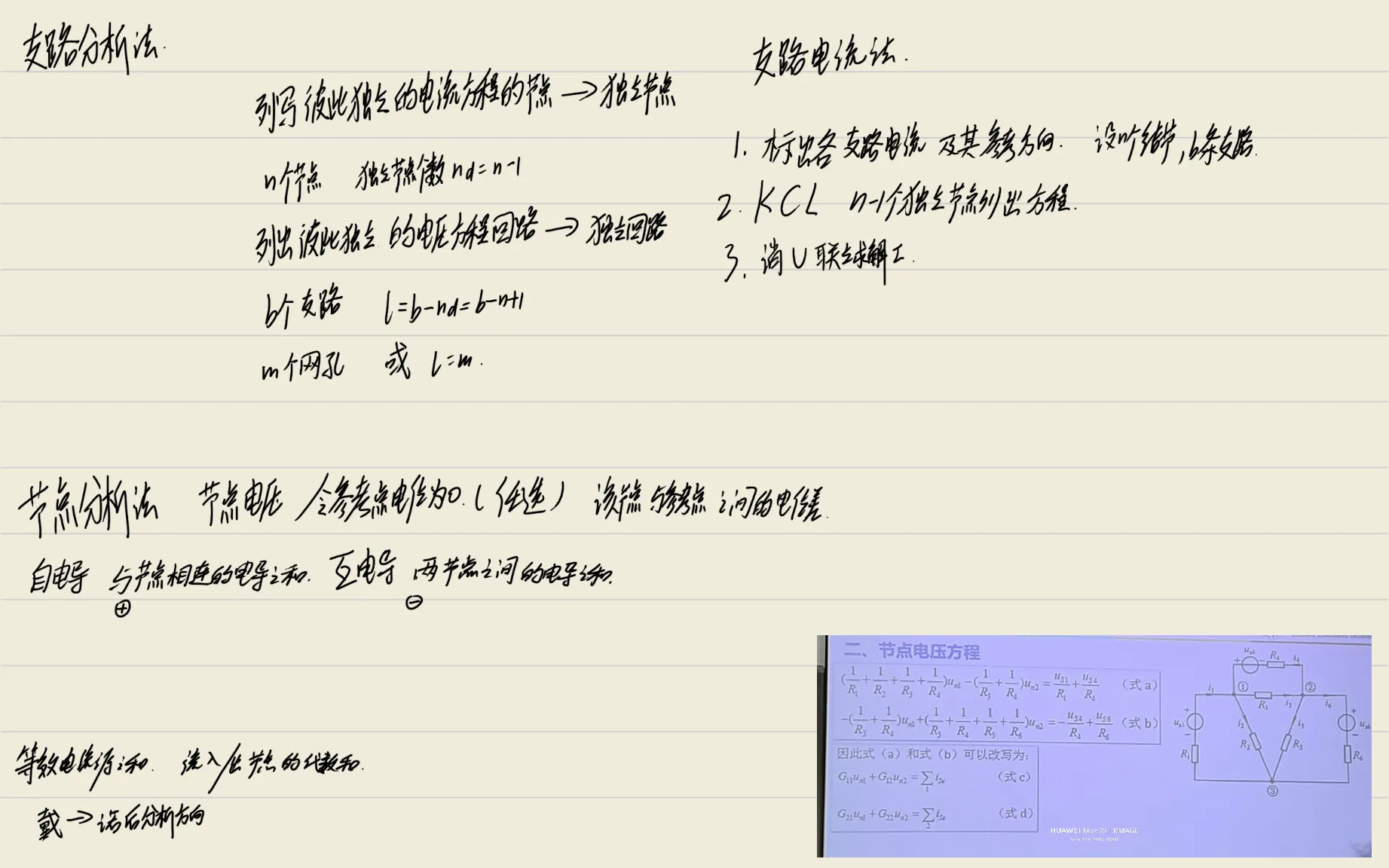 对于具有 个节点的电路,选择任意一个节点作为参考点,对其余 个独立节点列节点电压方程,标准形式概括为:自导乘以本节点电压与互导乘以相邻节点电压的和等于注入本节点的等效电流源电流之和。