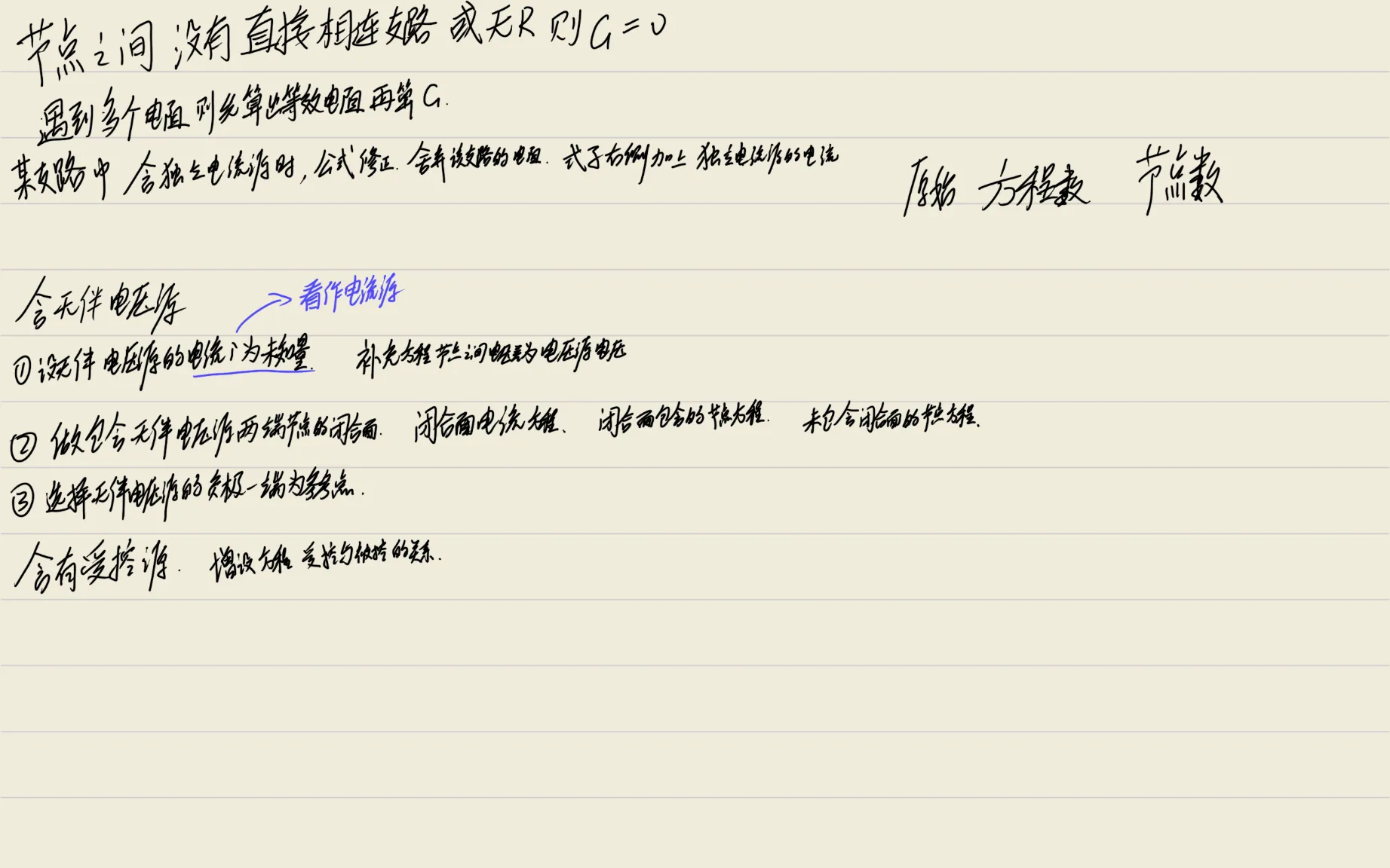 若电压源没有电阻串联相伴,称为无伴电压源。由于支路电阻为 0,支路电流不能用支路电压表示,推导节点电压方程时会出现困难。有三种处理方法: