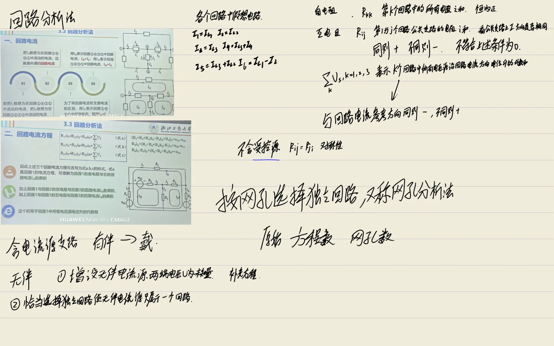 一般情况下,从电路中选择 个独立回路,回路电流方程的标准形式概括为:自电阻乘以本回路电流与互电阻乘以相邻独立回路电流的和等于本回路中各电压源电位升的代数和。